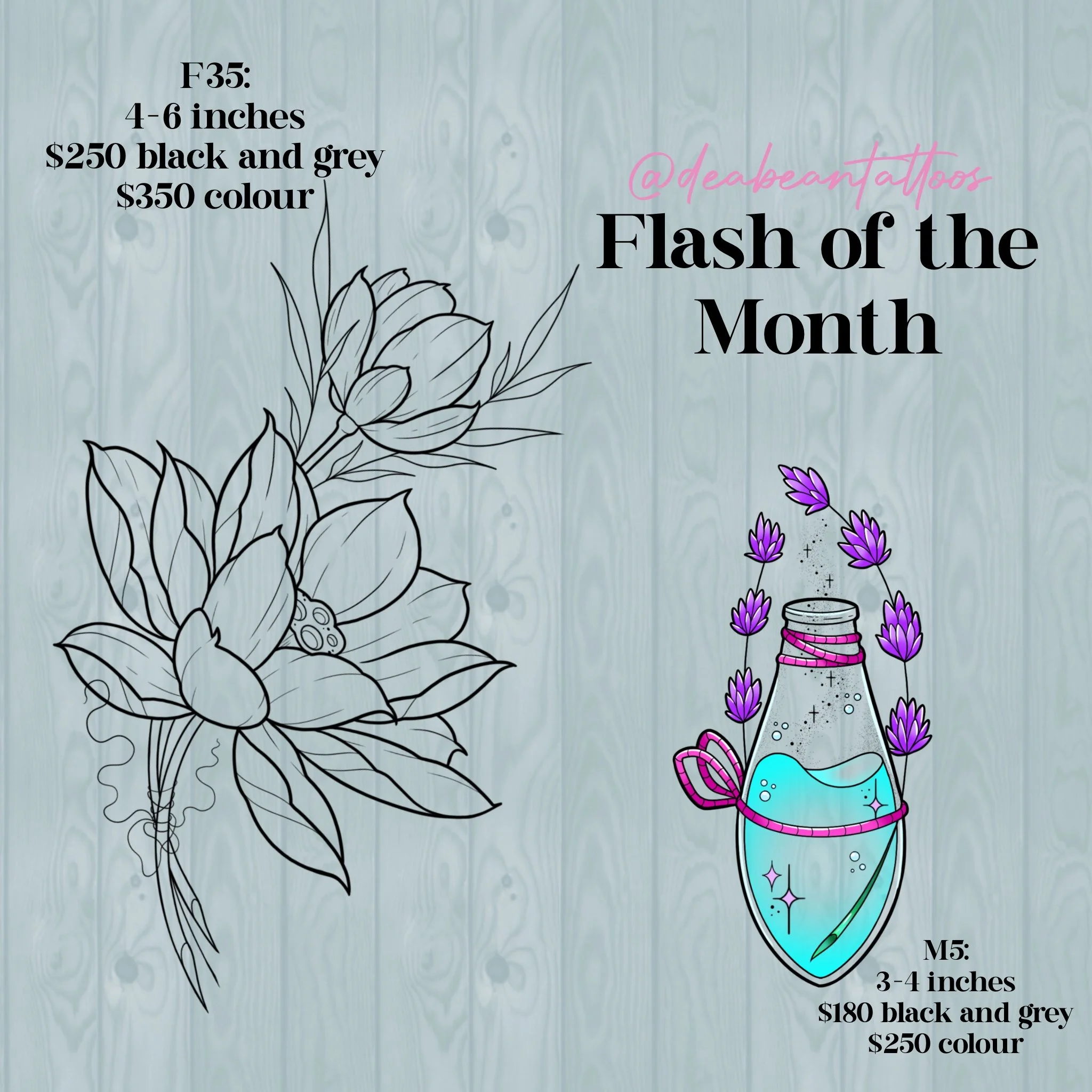 Every month we will have 12 discounted flash pieces (6 from each artist). You can pick if you would like black and grey or colour, and after that the artist will have full creative freedom for the tattoo. You are always welcome to book a consultation or email us if you would chat with the artist about their creative vision for the piece. Our current flash of the month selections will be available to view on the main events page (scroll down)!