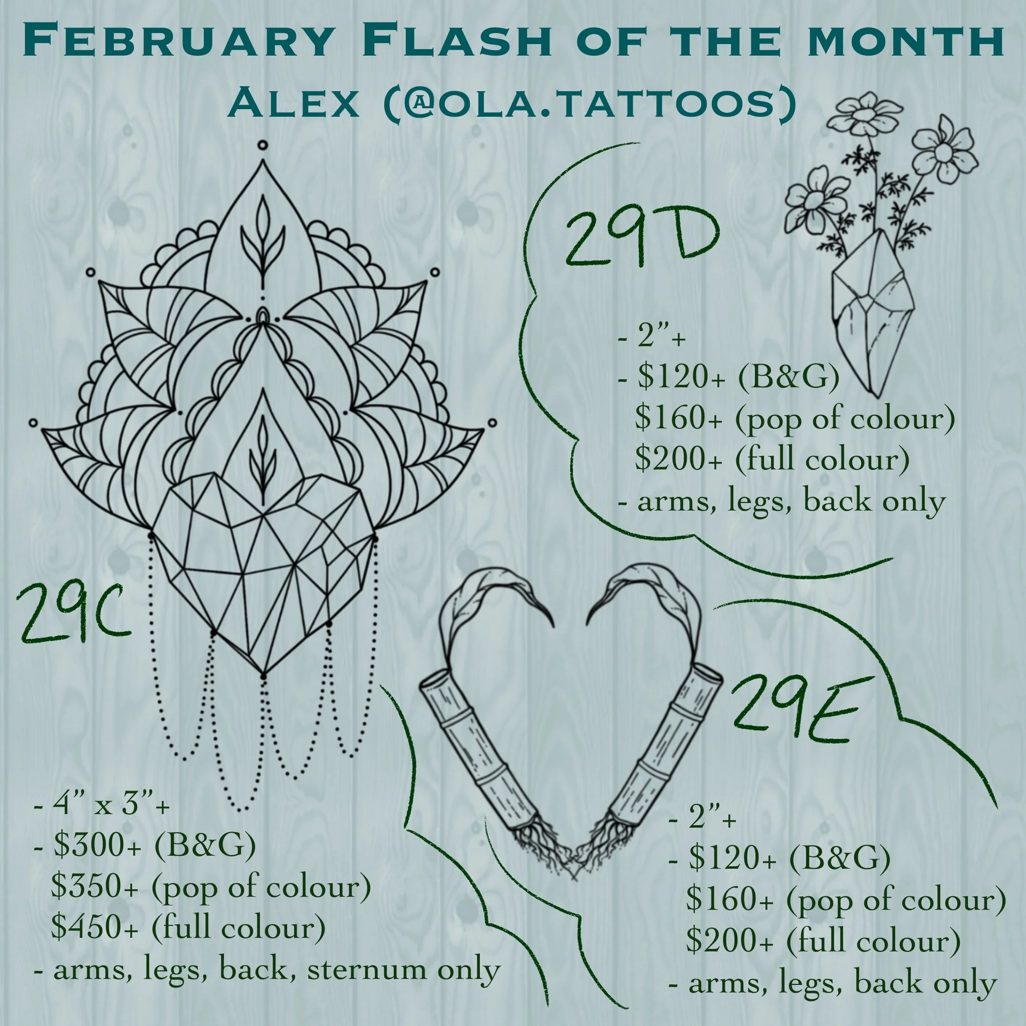 *$100 for black and grey, $150 for colour, set sizes of ~2-3”. No ribs or high traffic areas. Repeatable meaning each flash piece can be tattooed multiple times.